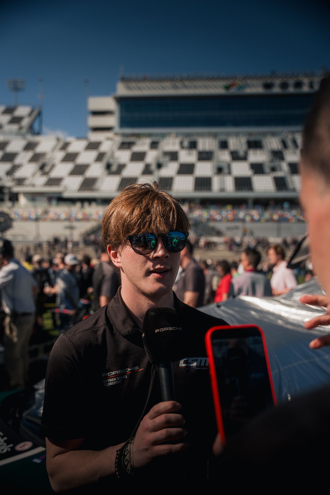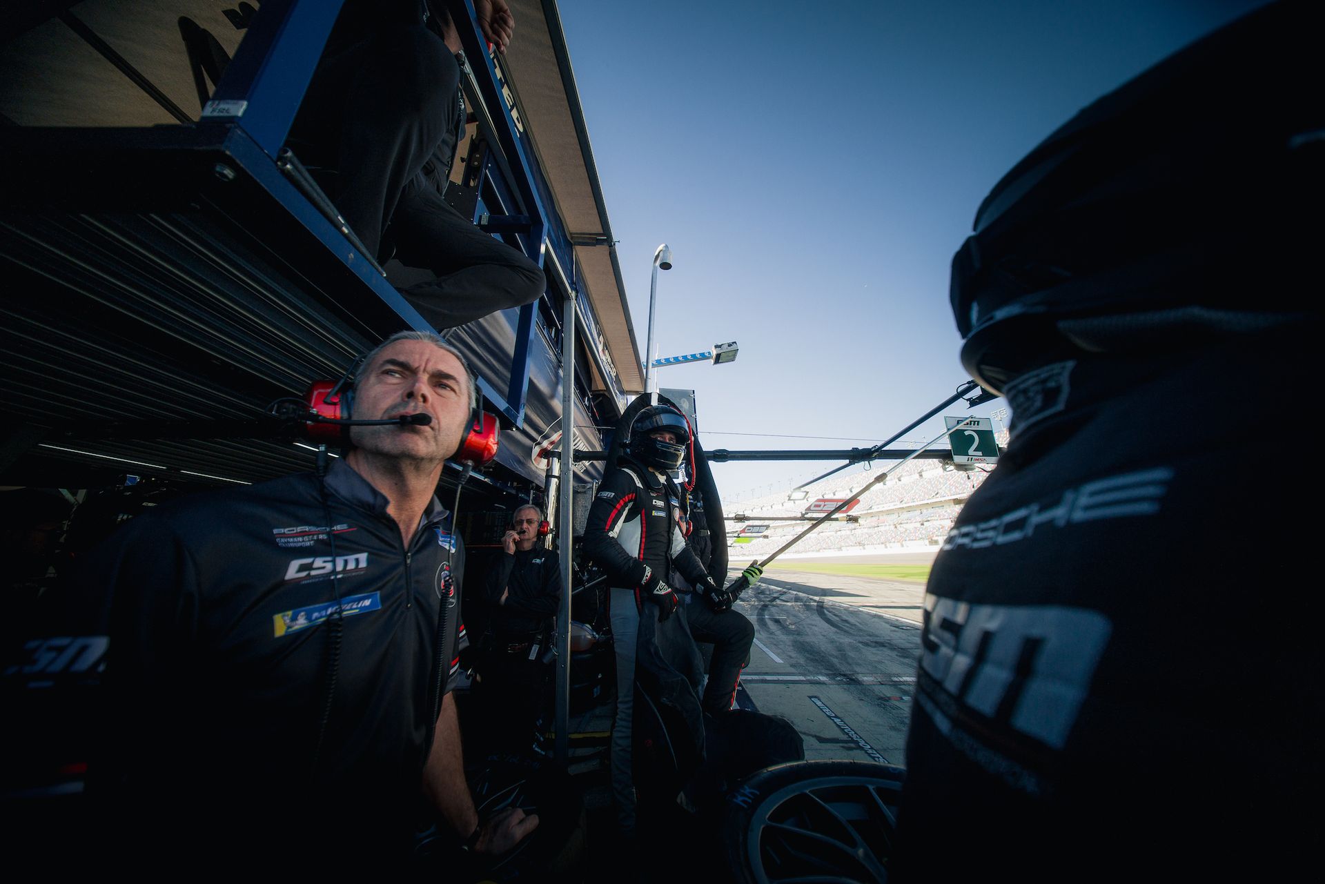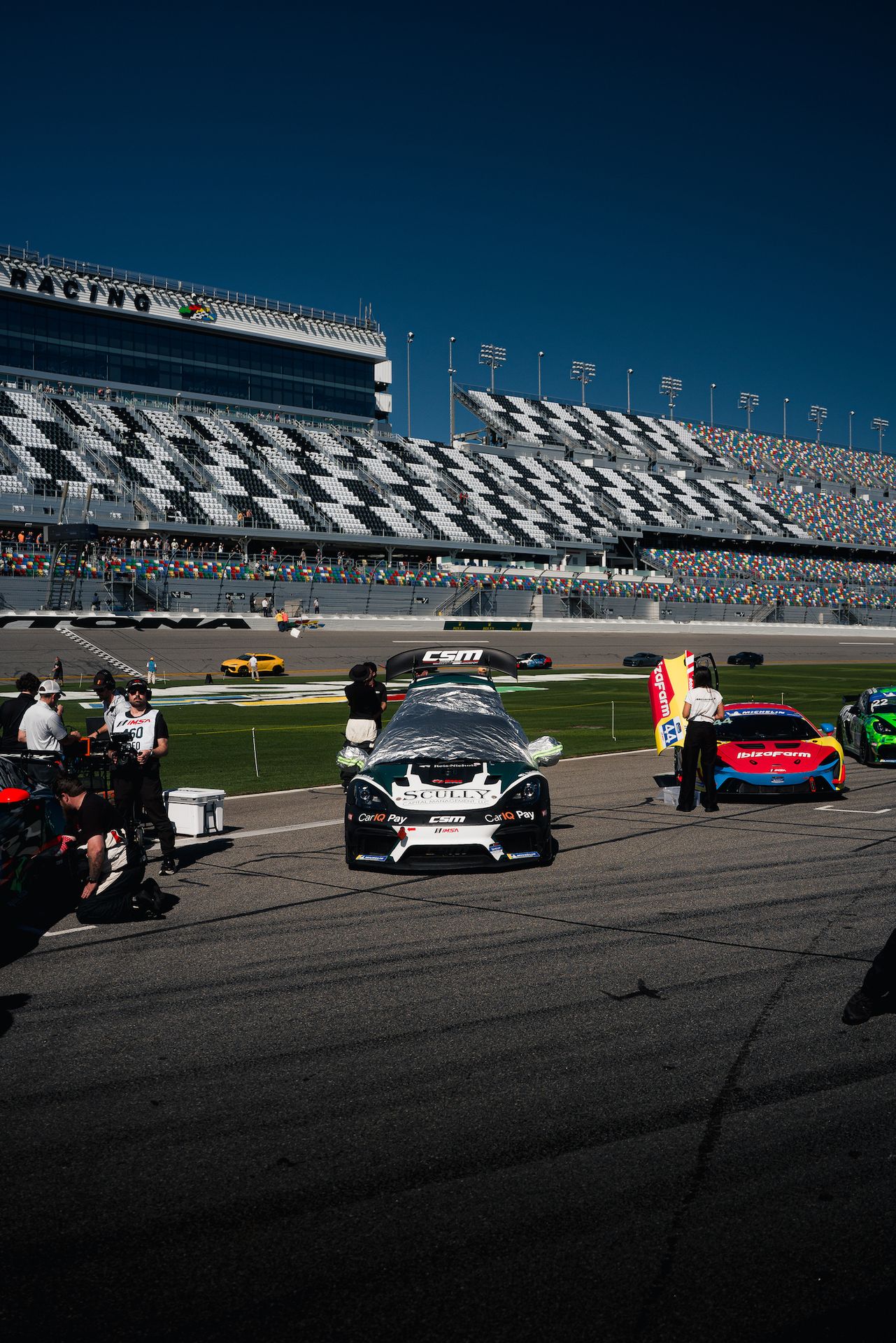 Fan walk at 12:45 - This is always intense, especially so here at Daytona. The fans have been pouring in for days and are on the grid in huge numbers today. The Michelin Pilot Challenge entry list is longer than it has ever been - with 35 GS cars and 16 TCR cars for a total grid of 51. That makes for a very busy race track! Even with so many cars lined up on the pit lane, they were still hard to see with so many people inundating the lane. It is very cool to see some of the same people first met in previous years back again for the excitement this year. The fans take lots of pictures and collect autographs. Some take a peek inside the car and ask some questions about the Porsche. Our car is conveniently located quite close to our pit box at pit center where the fans flow in and the opening ceremonies are held. If you look closely at the broadcast, you can see the CSM on the raised boot lid of our car center screen.