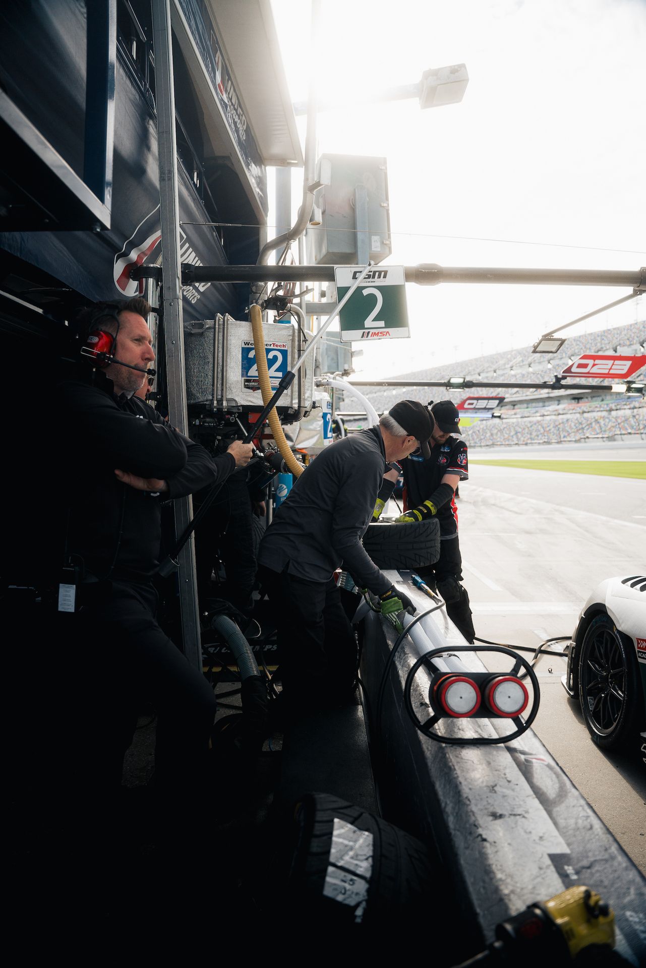 We walk more and talk more, visiting with friends and touring the pit lane. These WeatherTech teams have some serious lighting, banks of data and video screens, and stacks and stacks of tires and spares in their spaces. It's all ready to go at a moment's notice. Most teams across the four classes in this race will make between 25 and 35 stops in the 24 hours. That doesn't give the crews much time to rest or eat between them. It's exhausting!