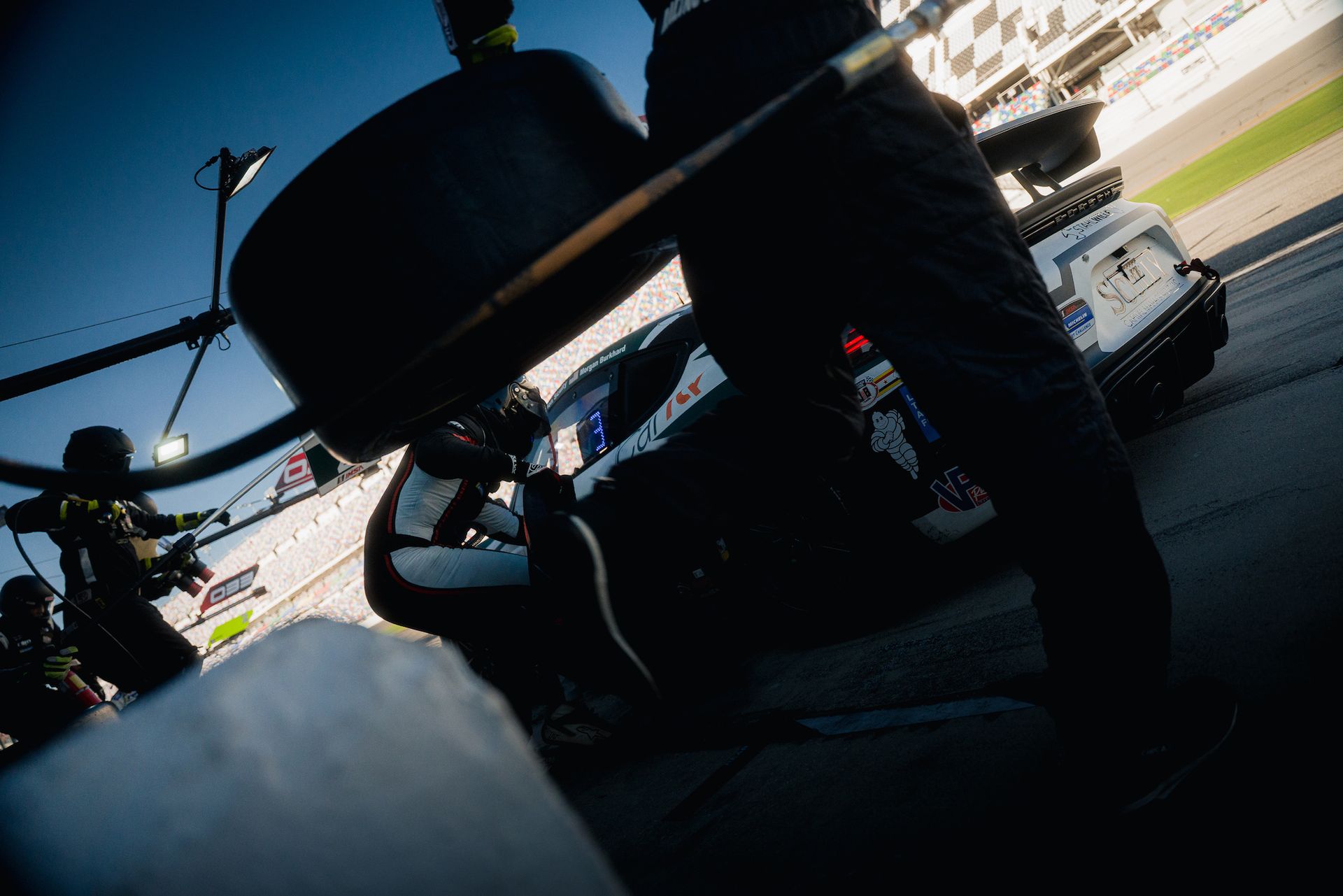 When green flag laps really get going again on Lap 33, Gordon has a good run for fourteen laps. During that time, he makes steady progress, moving the #2 Porsche up from last in class at the start of his stint all the way up to 20th in class. Lap 47 brings another opportunely timed yellow flag. Gordon has run a little over an hour. He's kept it clean and moved up - exactly what's needed at this stage of the race. Now, it's time to hand it over to Morgan who, from this point forward, will have the wheel for the remaining two and a bit hours. The crew tops up the fuel and puts two tires on the right side of the car where the load and degradation are highest, especially through the banked turns on the speedway. That quick stop gets Morgan out of the pits in 12th.