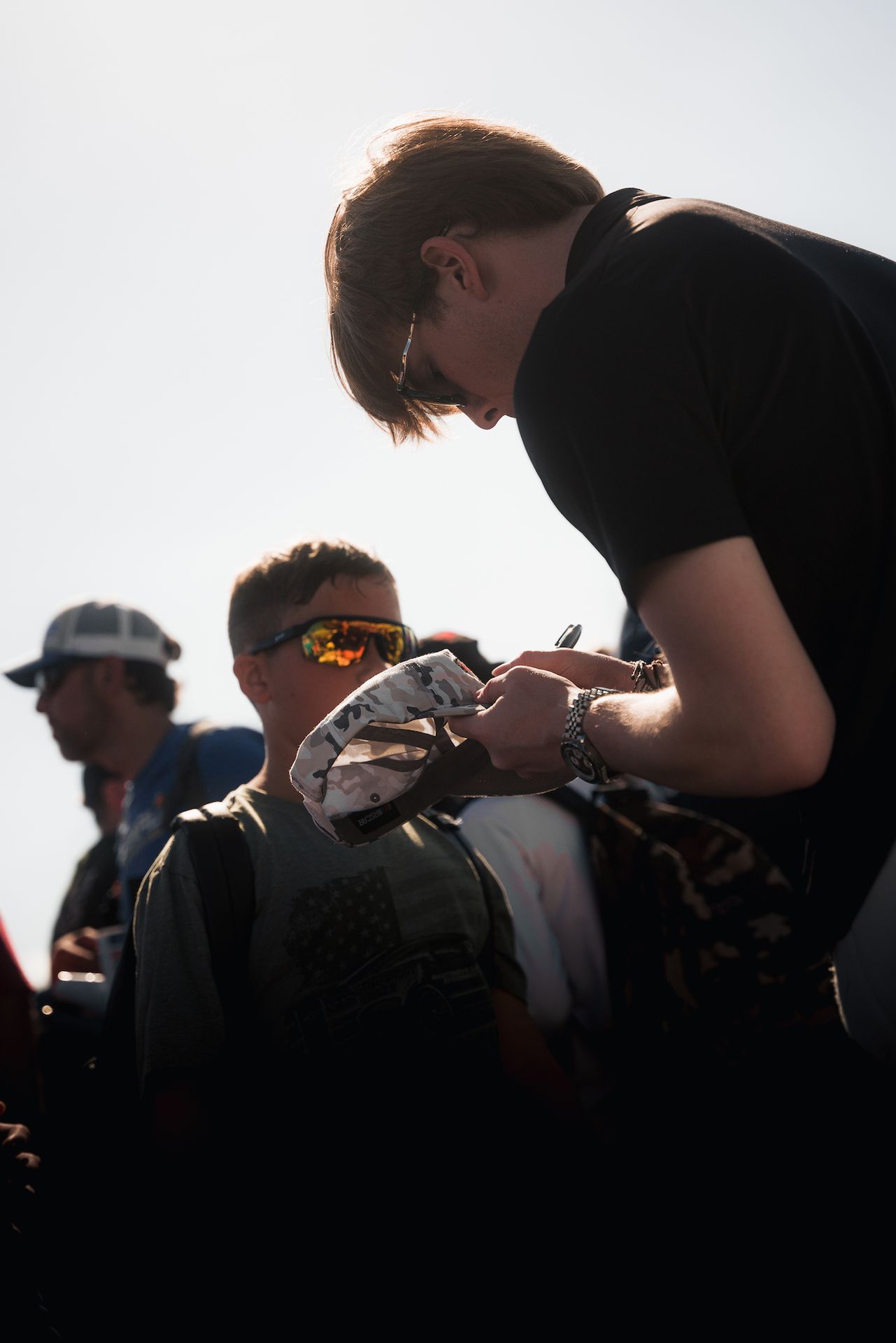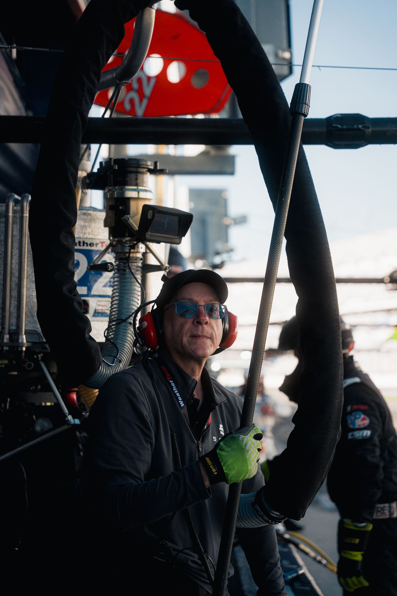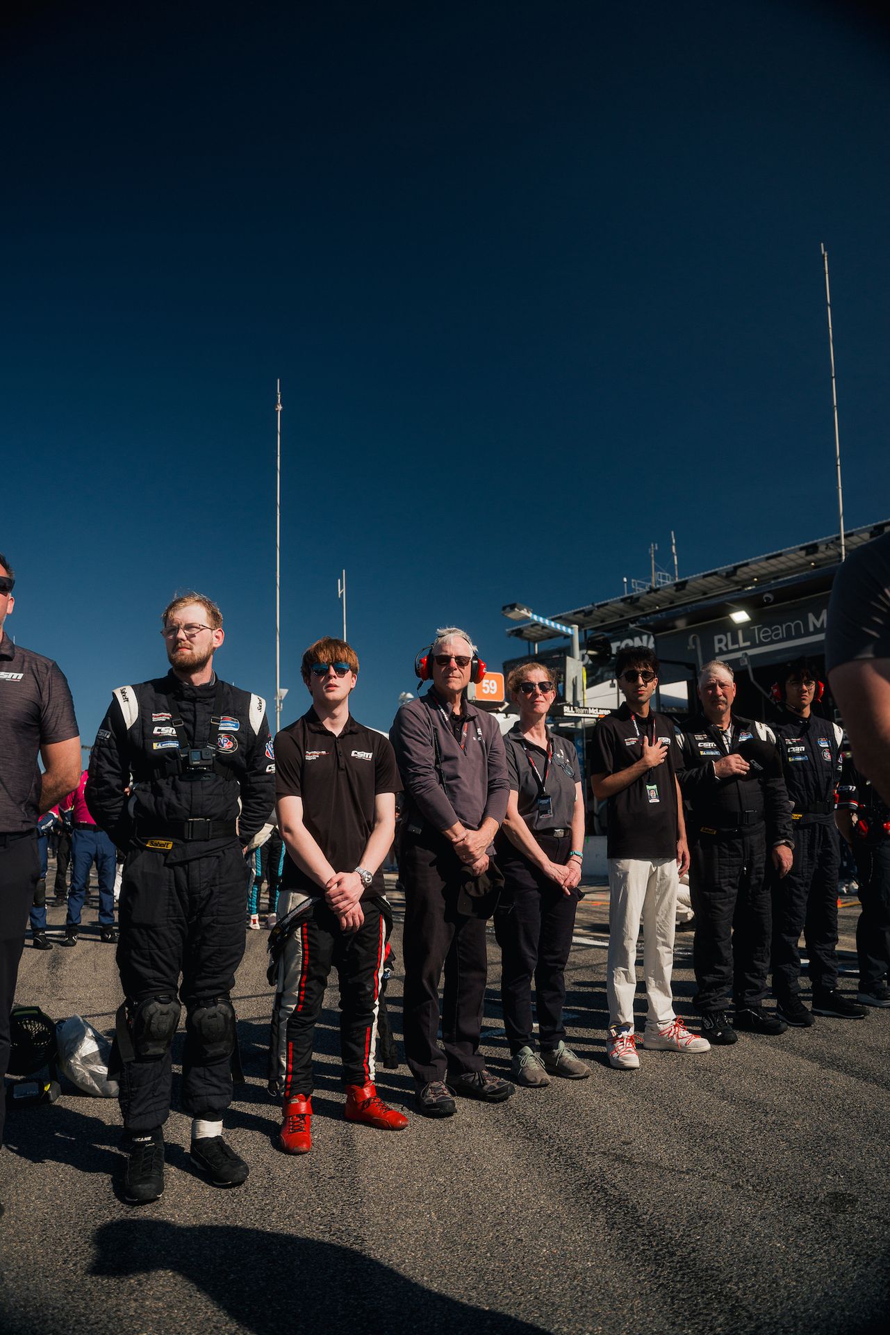 During the last track session of the day, we watch MX5 Cup Practice 2 from the pit lane. Their spotters, dressed all in black, perch like ravens atop the grandstands. They follow their cars with binoculars and give the drivers information about other cars close to them, especially on the banking. As the pack navigates the circuit clumped together, the spotter’s heads all turn in unison.