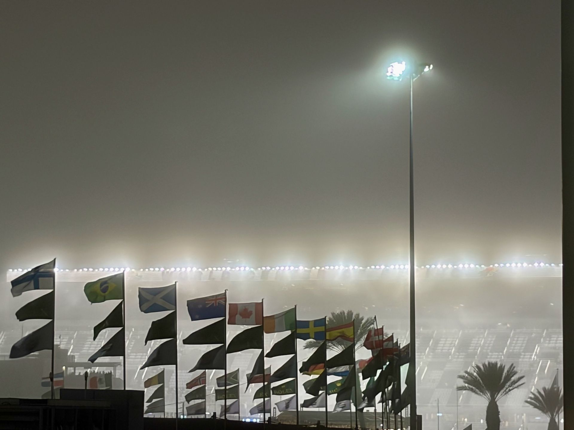 Suddenly, we realize it's 10:00! That weird popping noise is not coming from the race track - it's time for the fireworks show! Those are beautiful, but rather odd. We can see the ones that pop low fairly clearly, but anything going up high just tinges the fog in bright colors, adding to the surreal feel. (If you want to see the sparks, they are better viewed on TV.) More walking. More talking. More watching. Eventually, after midnight with the fog thickening, we pack it in and head home again. We keep watching for a while on TV, but when a full course yellow comes out, we know it will stay until the fog clears in the morning. It's bed time, but the adrenaline and excitement of the day take a while to subside and let sleep come.