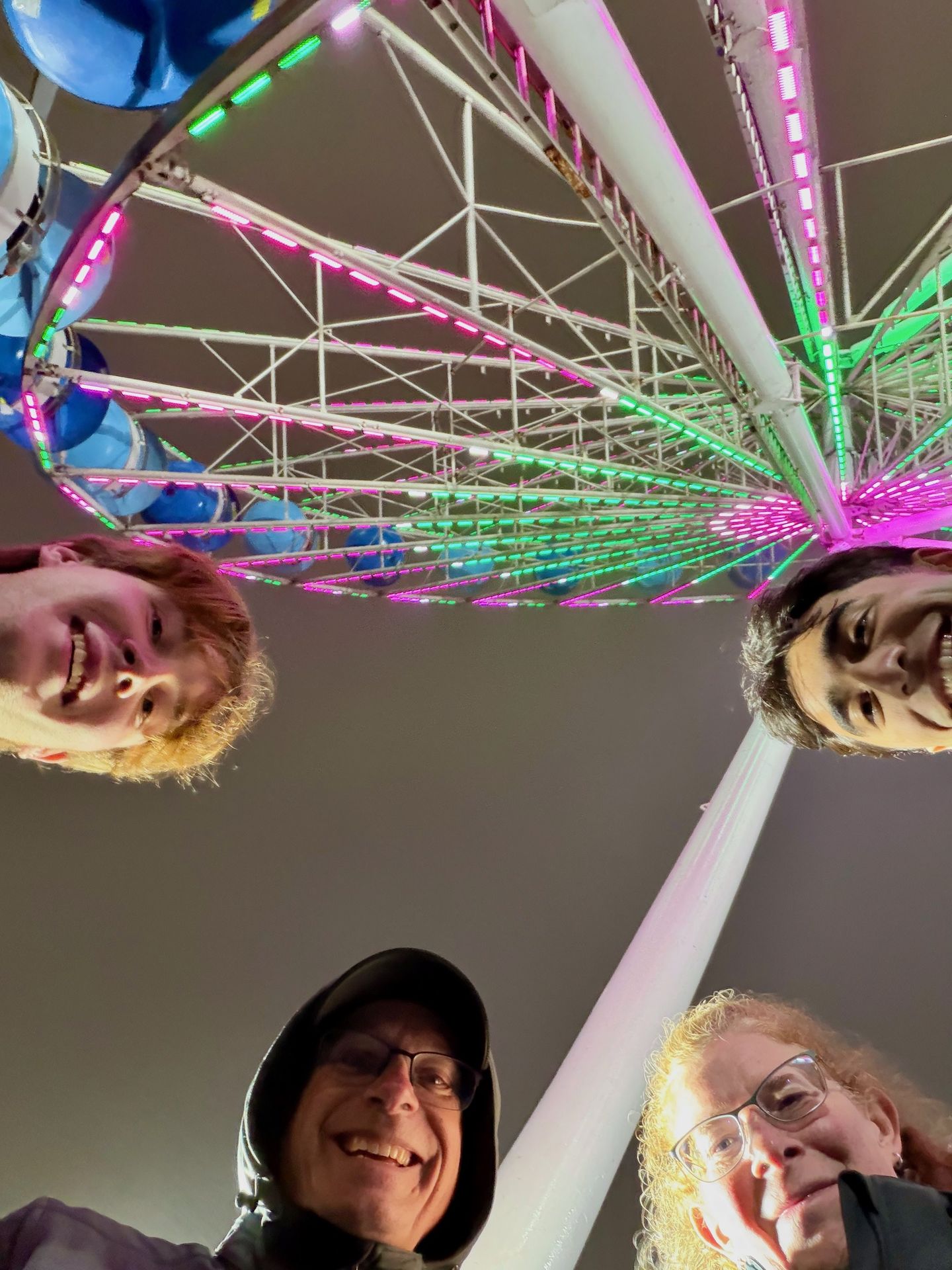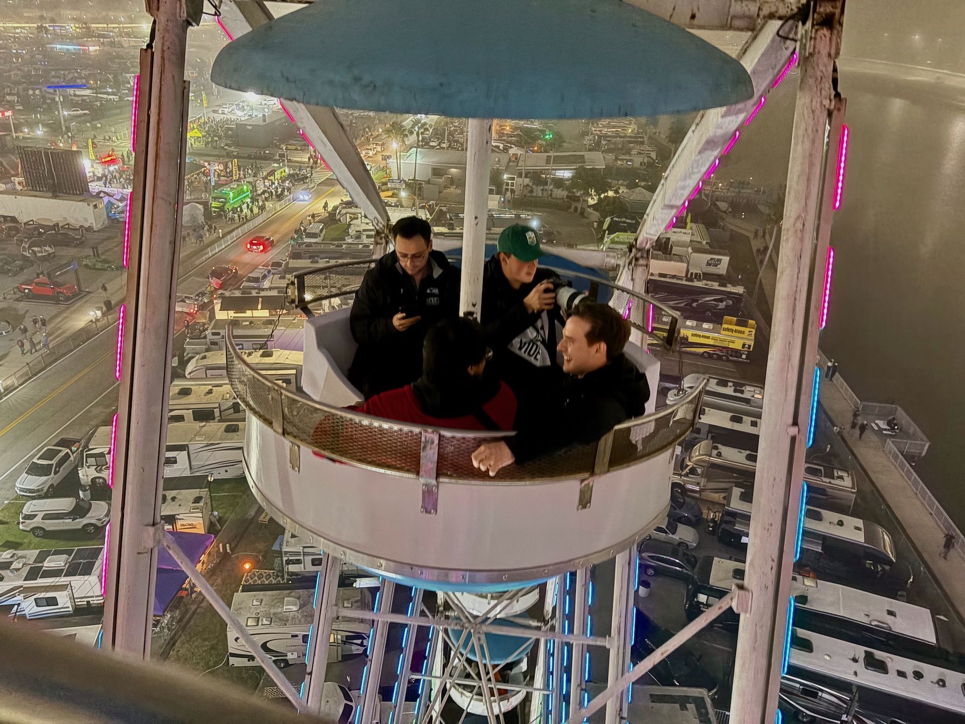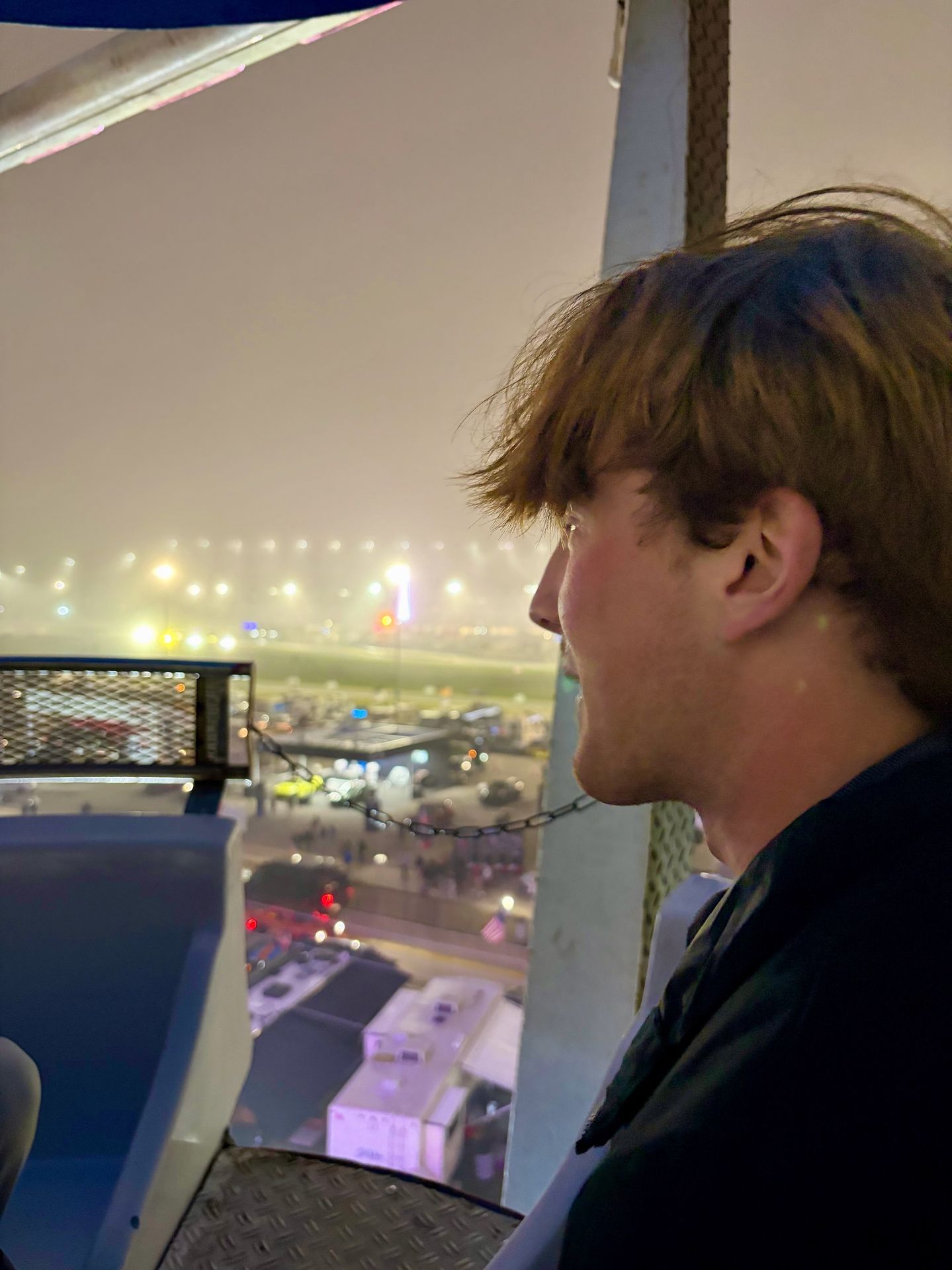 When we head back to the track, it's dark and windy. The temperature has fallen and the fog is rolling in. It feels like the lights and sounds of Daytona are separated from the surrounding city and enclosed in a big misty bubble. Even so, the random meetings with friends keep coming. A pack of eight of us decides that a ride on the 125 foot tall ferris wheel would be fun. Let me just say... That ride (slightly terrifying but completely amazing) is totally worth the $10 to rise high above the track at night. We can see the entire track from up here, but not a single thing beyond it, all else lost in fog.