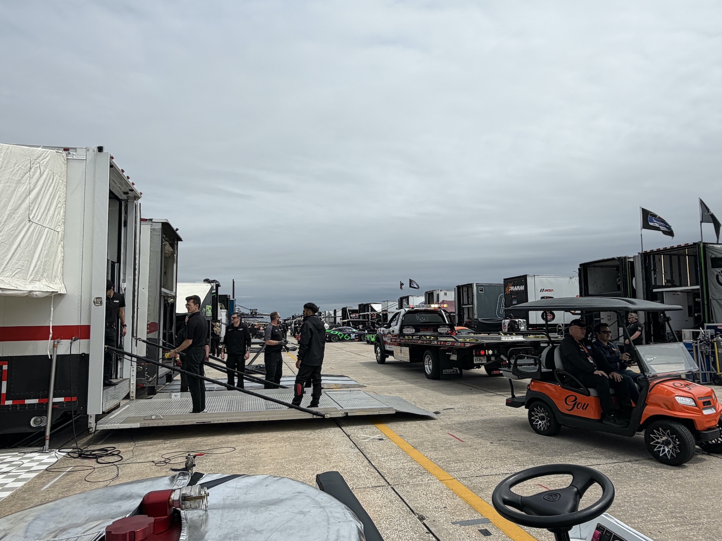 We know Sebring really brings out the fans, partly because it’s spring break week, but largely because of the history here. Even so, when arriving yesterday, we were surprised at the enormous number of campers already queued and waiting to be let into their infield slots for the weekend. This morning they are already making rounds of the paddock. Their enthusiasm is wonderful!