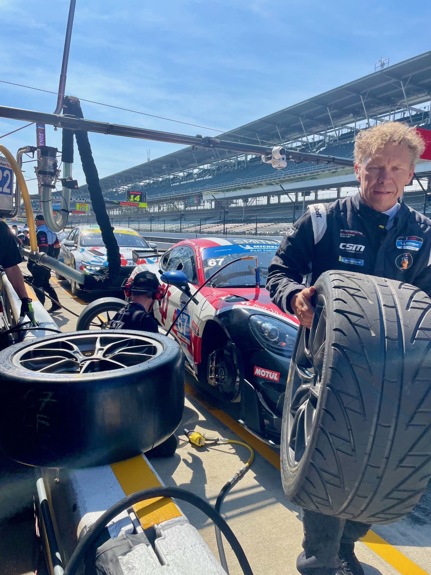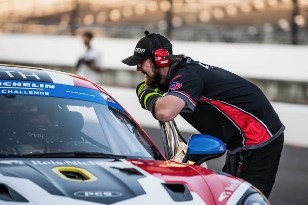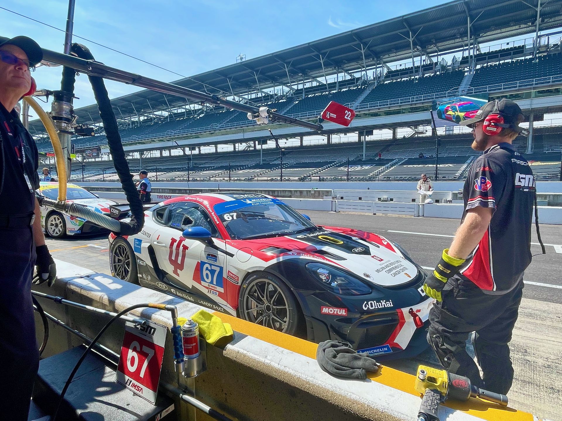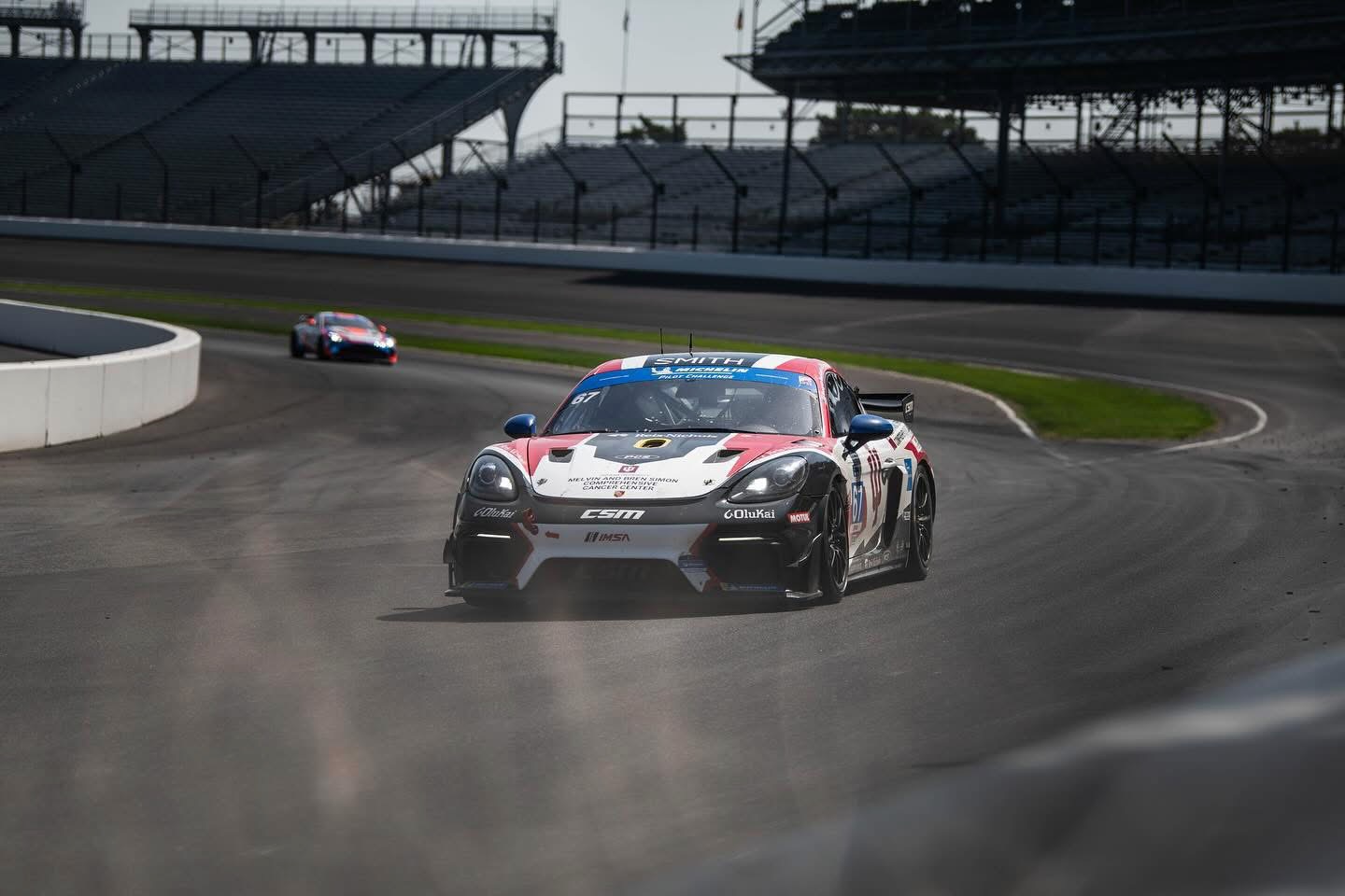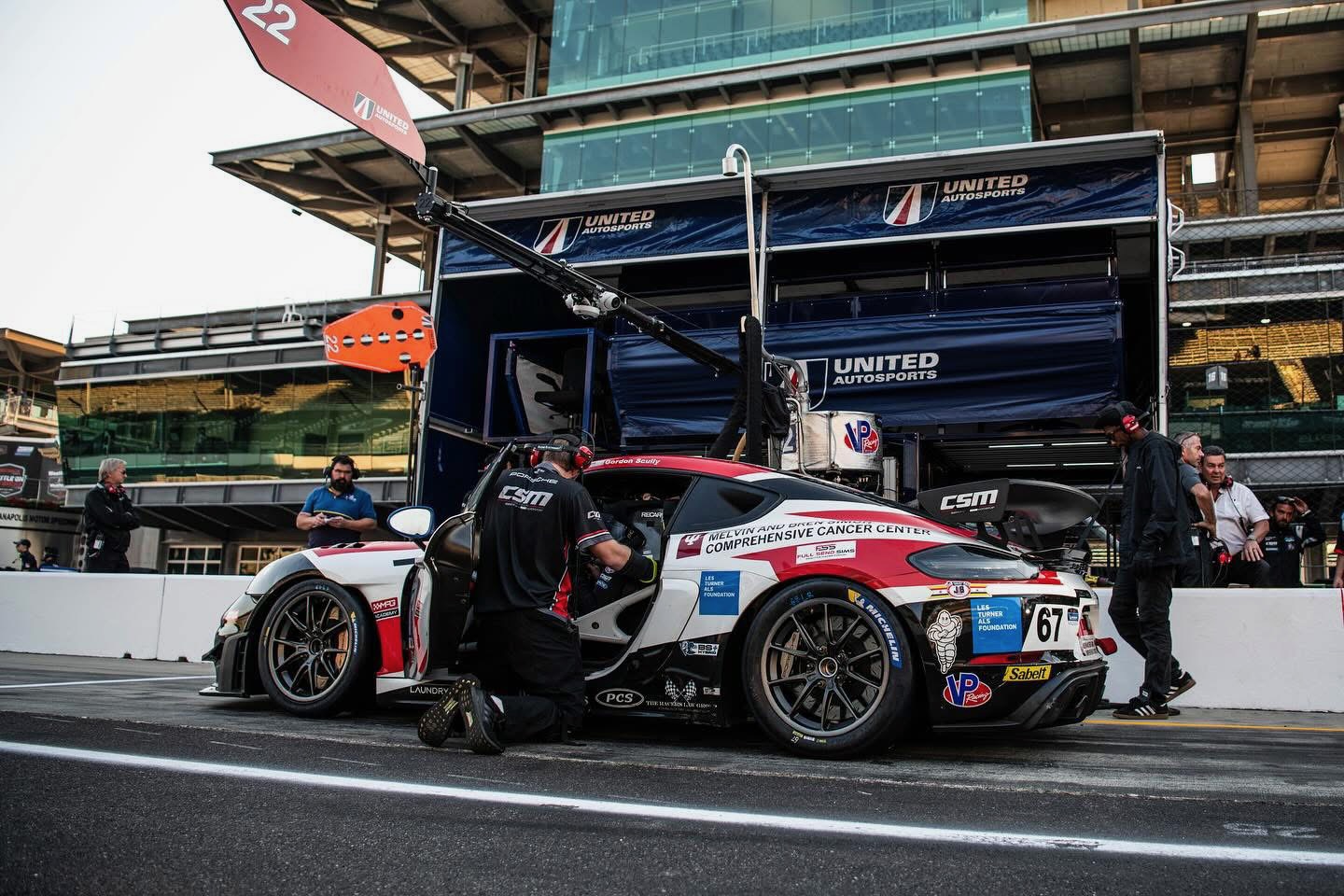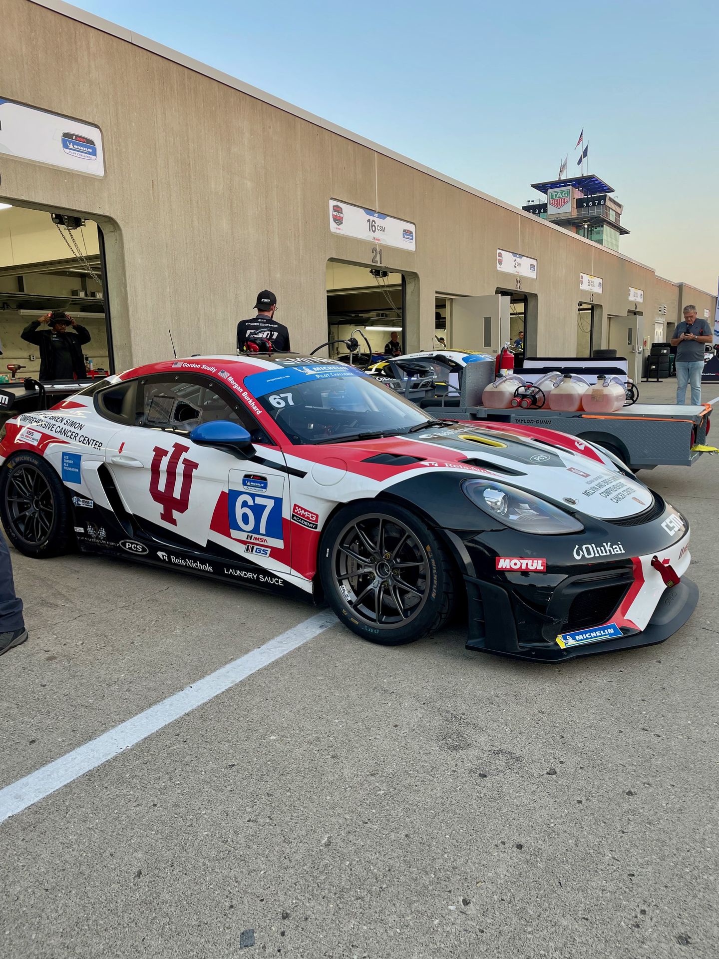 Today is going to be great! We had a practice here a couple weeks ago and everyone is psyched. This is Round 9 of the IMSA Michelin Pilot Challenge - the Indianapolis Motor Speedway 120. The CSM #67 with Morgan and Gordon driving carries Indiana University and the Melvin and Bren Simon Comprehensive Cancer on the livery this weekend. That alone grabs some extra fans while IU also hosts homecoming weekend.