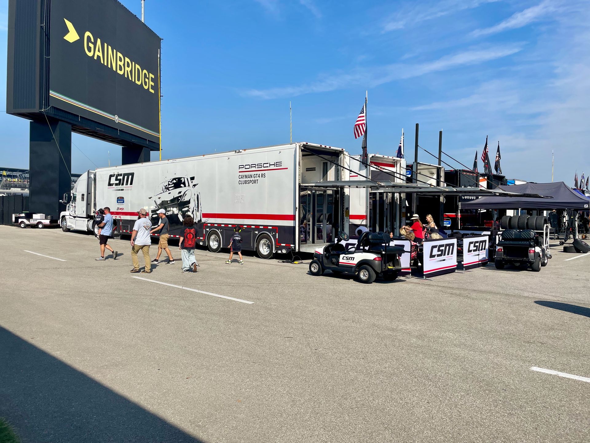 From parking, it's more than a quarter mile to where the CSM trailer is parked. We do our best to travel light and not to forget anything in the car. When we get there, trailer-land is laid out sort of like a tightly packed subdivision, each team in its own townhouses, with narrow streets all at right angles. Fortunately, we have a nice corner lot, close to a great viewing spot at Turn 13. The garages are almost another quarter mile from here back toward the Pagoda. Golf cart and tugger traffic is constant as people and equipment shuttle back and forth. Pay close attention as you walk around! A further quarter mile from the garages is the pit box at the foot of the Pagoda - more on that space later.