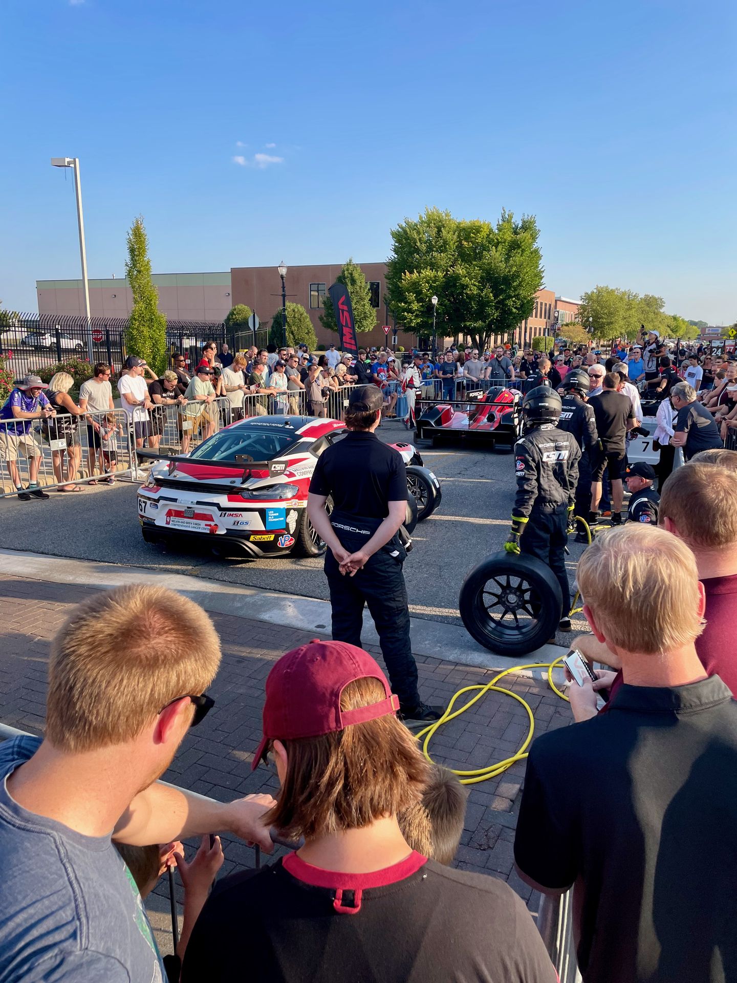 Indy offers a special treat for us this weekend. Nearby the Speedway, a few blocks of Main Street are blocked off for a couple hours this evening for a Fan Fest. Twenty cars from across the weekend's four featured series line up on the street and fans can get up close to them - just like the fan walks before the races, but without needing tickets. A pit stop competition is a featured event and our Porsche #67 guys are up against a WeatherTech Porsche Penske GTP team. It's not a fair fight, not even a little bit. They get four guys to our three and they have a single center lug on the tires whereas we have five per tire. Their car is on the ground again before we have finished the first side. Johnny, the lead pit lane IMSA official and commentator for this challenge, makes the point clear: We have the much harder job. Still, it's fun to watch and cheer on our guys.