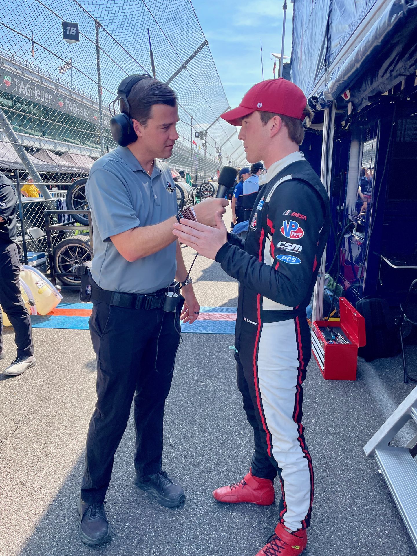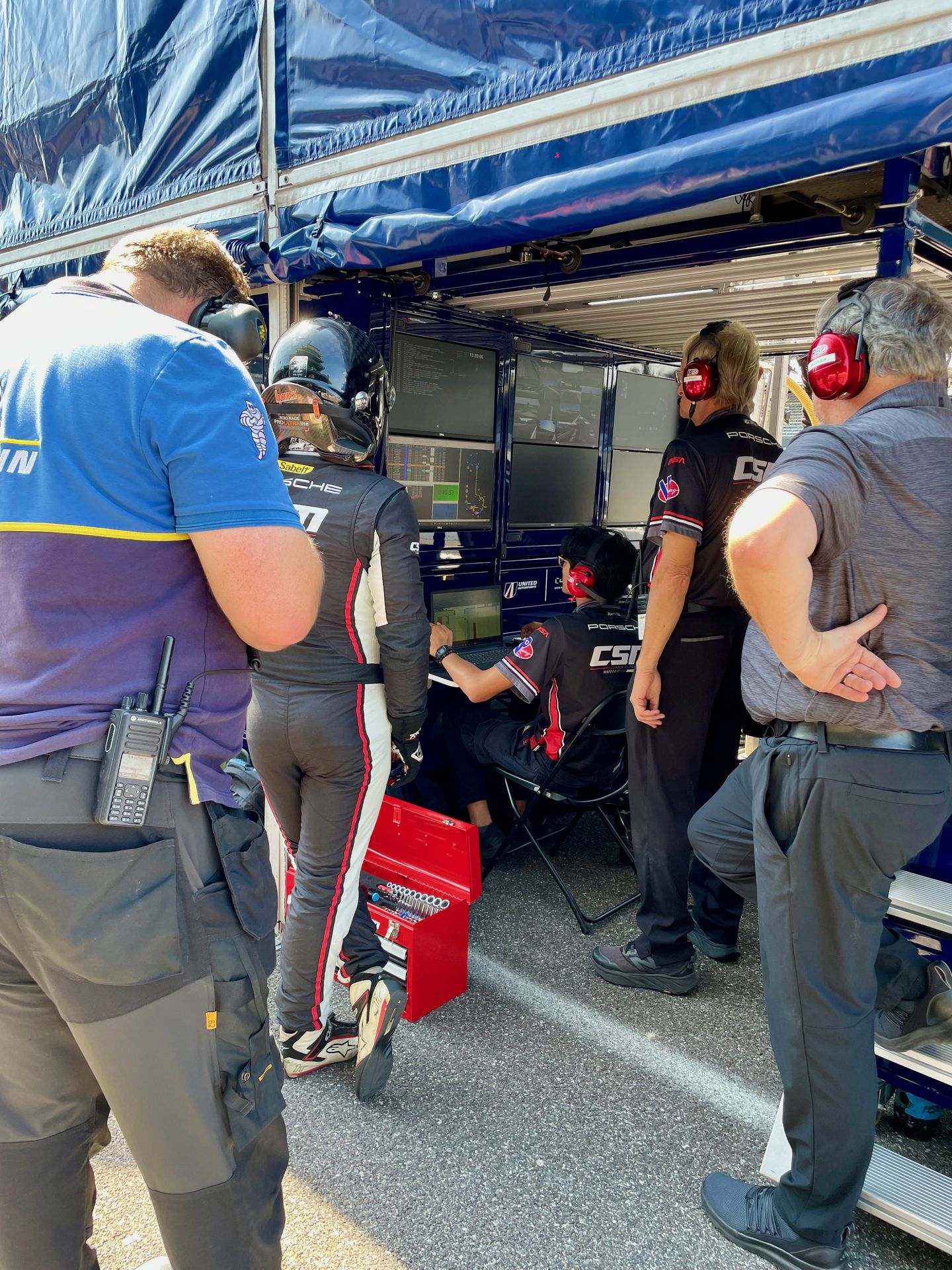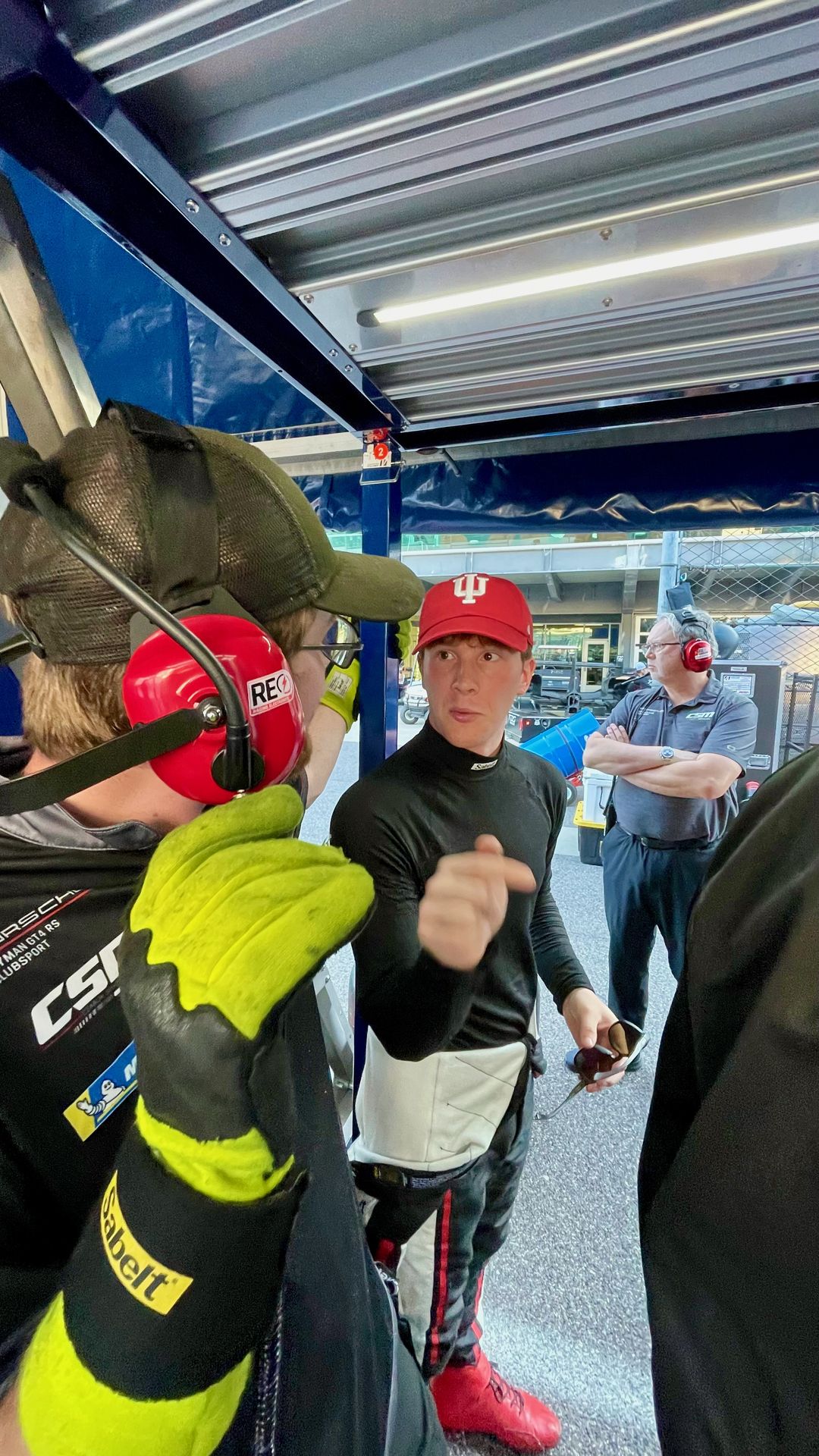 Practice 2: It’s so much hotter this afternoon for Practice 2, like almost 90 degrees. Not too humid so we aren’t melting desperately, but it’s still toasty. Race cars don’t like heat much and the times reflect that. Nearly everyone runs slower this afternoon as expected, with only a handful of drivers in the top half going quicker. Even so, the higher temperature didn’t sap the performance as much as it might have for us. Morgan still put the car in fourth. This session coincides with race time tomorrow, so again we get good information about race conditions. Still, at the end of Practice, we are the fastest Porsche and all three CSM cars are in the top ten today. That performance gets him an interview too. Awesome!!