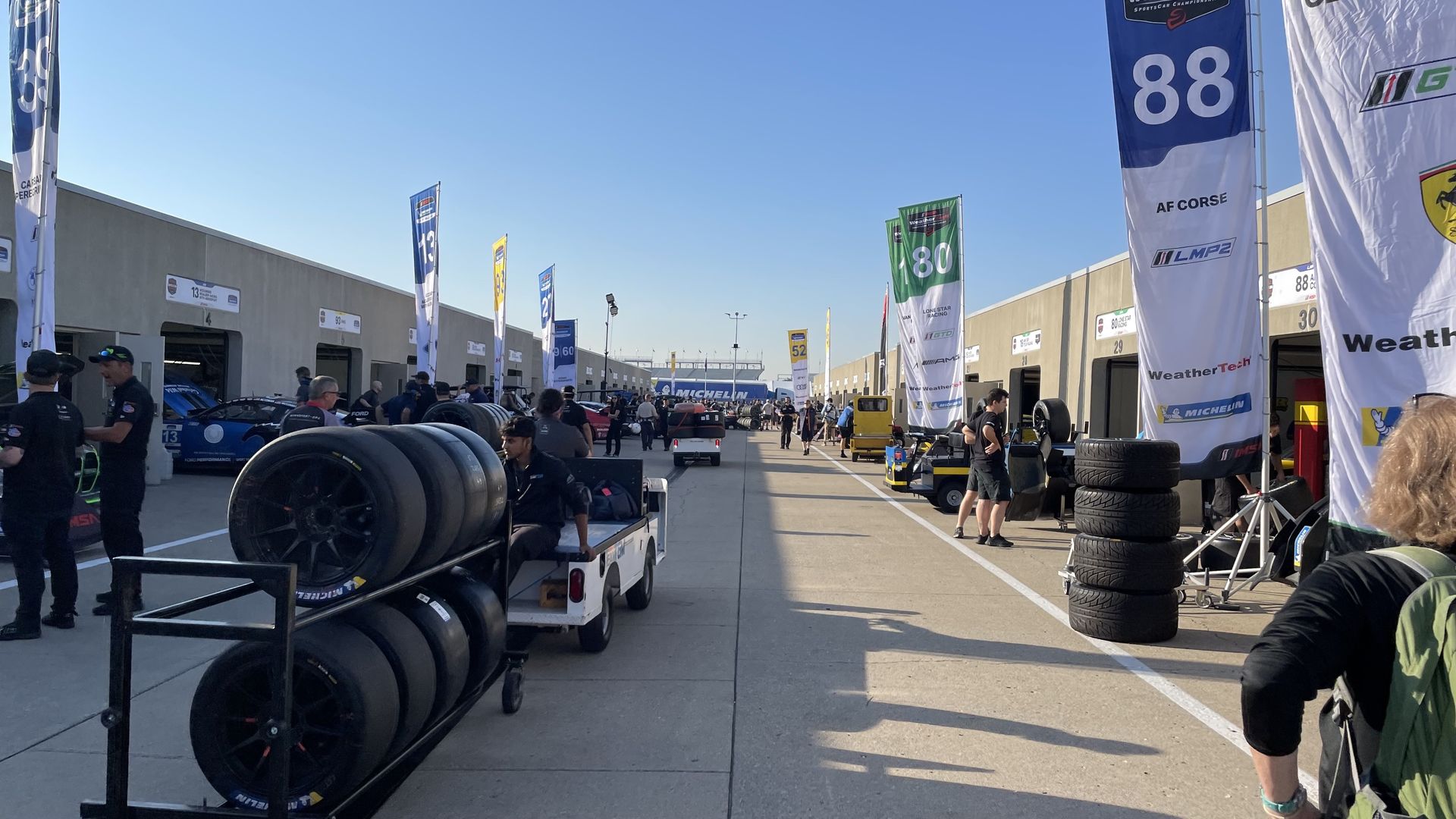 This morning there is extra energy. Michelin Pilot qualifies at 8:00, and WeatherTech follows with their second practice ahead of qualifying later this afternoon and their 6 hour race tomorrow. So all the WeatherTech garages are alive with activity. Of course, it being Saturday, the spectator count is ratcheted up two or three notches. Paddock traffic now has the new element of enthralled fans strolling through along with crews and traffic rushing about.
